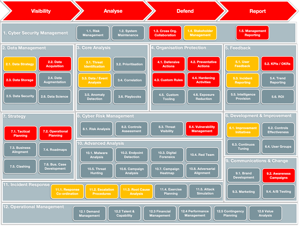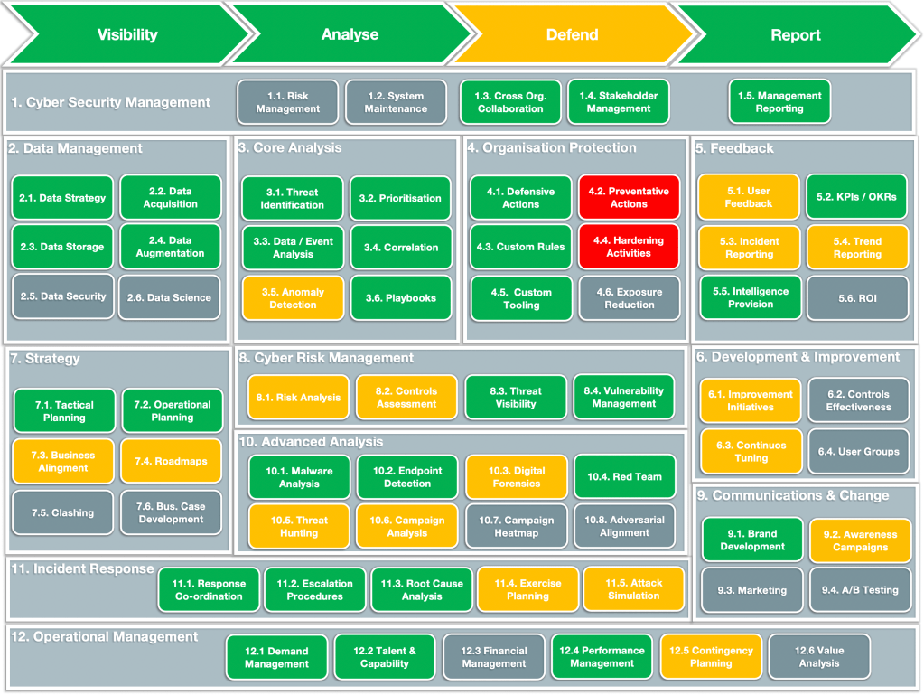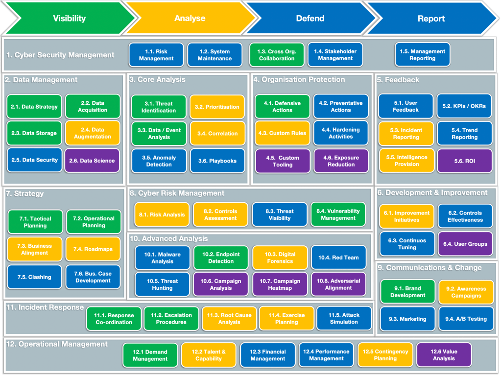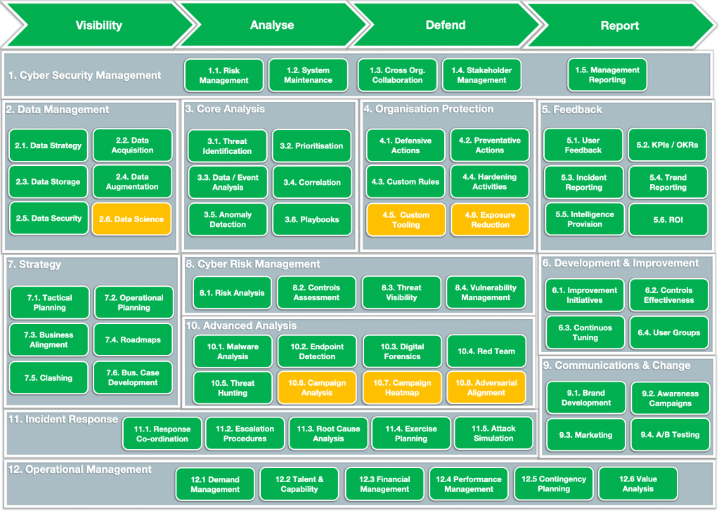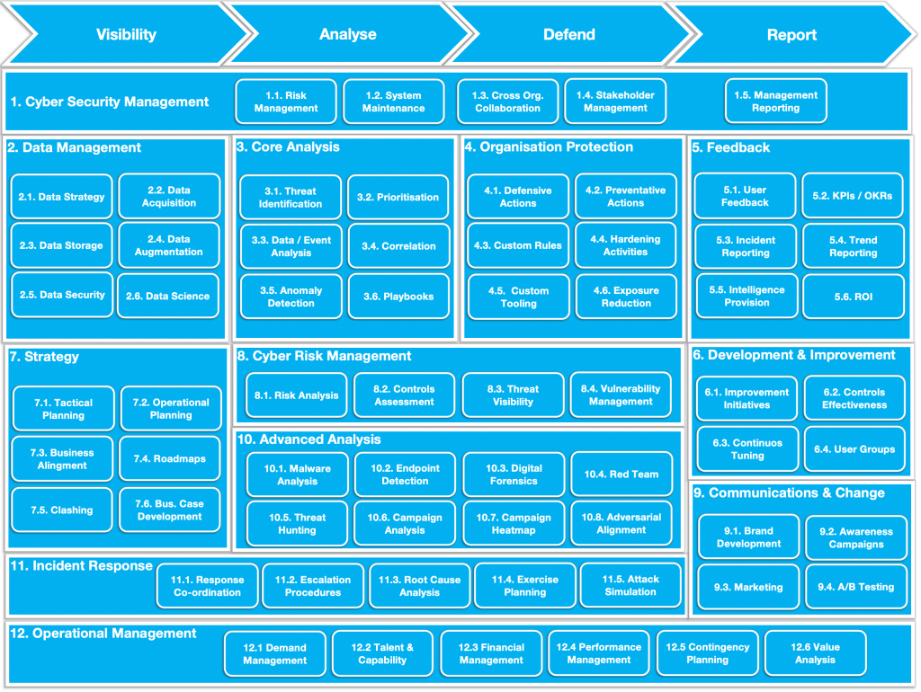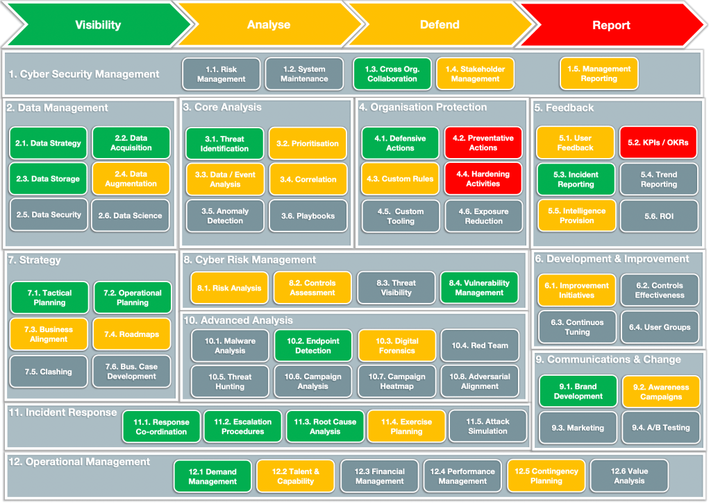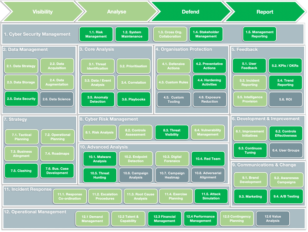 We have developed a model that caters for the full gamut of cyber capabilities. The model provides a top level capability, underlying functions, that each in turn are made up of several supporting components. The model has been designed from mixing best practice / standards with the knowledge from practically building, maintaining and optimising cyber capabilities in multiple organisations and sectors.