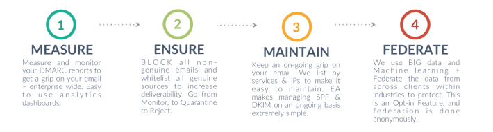 Enables you to maintain continuous email authentication through the implementation of Domain-based Message Authentication, Reporting and Conformance (DMARC). Simplifying the implementation of DMARC to increase adoption is the EmailAuth mantra. Which not only prevents phishing in your name, but also provides you the visibility of your own email performance, an increase in deliverability to the inbox, and ensures you are getting value for money from third party email providers.
